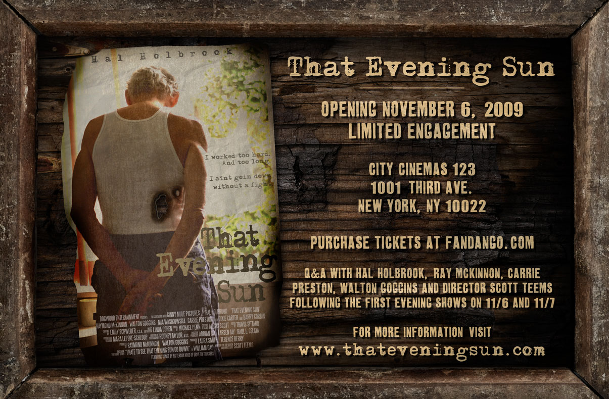 I first saw THAT EVENING SUN at a screening in Tribeca. The second time I drove three hours to the Newport Film Festival. (Disclosure: part of the reason was to hang out with writer/director Scott Teems, who is also my comedy filmmaking partner. Scott wrote a part for me in the film — a stand-up comic bombing at the nursing home, but the scene was cut before shooting. Not to brag, but the director said I would have been “perfect for this role.”)